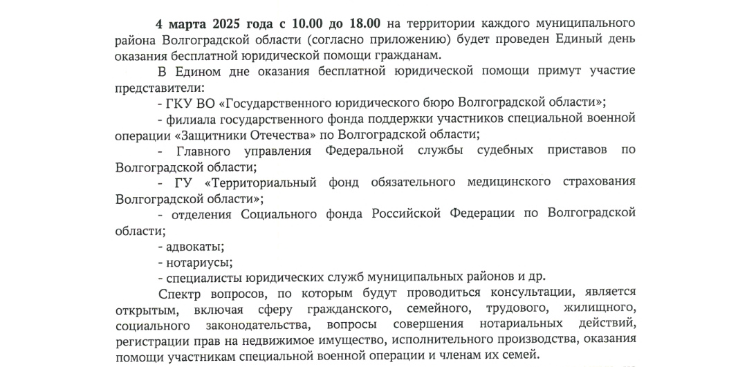 4 марта 2025 года с 10:00 до 18:00 в здании администрации Городищенского муниципального района по адресу: р.п. Городище, пл. 40-лет Сталинградской битвы, д. 1, будет проведен Единый день оказания бесплатной юридической помощи гражданам.